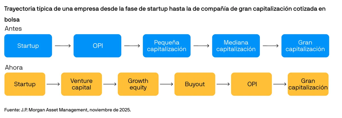 Hoy en día, esta secuencia de crecimiento se ha trasladado a los mercados privados. Ahora, las empresas permanecen en el ámbito privado durante más tiempo y alcanzan una escala mucho mayor antes de salir a bolsa, si es que llegan a hacerlo. A finales de la década de 1990, la edad media de una empresa en el momento de su oferta pública inicial (OPI) en EEUU era de unos 5,5 años; en 2024, había aumentado hasta los 14 años. En 1996, cotizaban en las bolsas estadounidenses más de 8.000 empresas; hoy, no llegan a las 6.000. Solo en la última década, el número de "unicornios" privados —es decir, startups financiadas con venture capital y con valoraciones superiores a los mil millones de dólares— se ha multiplicado por ocho.
