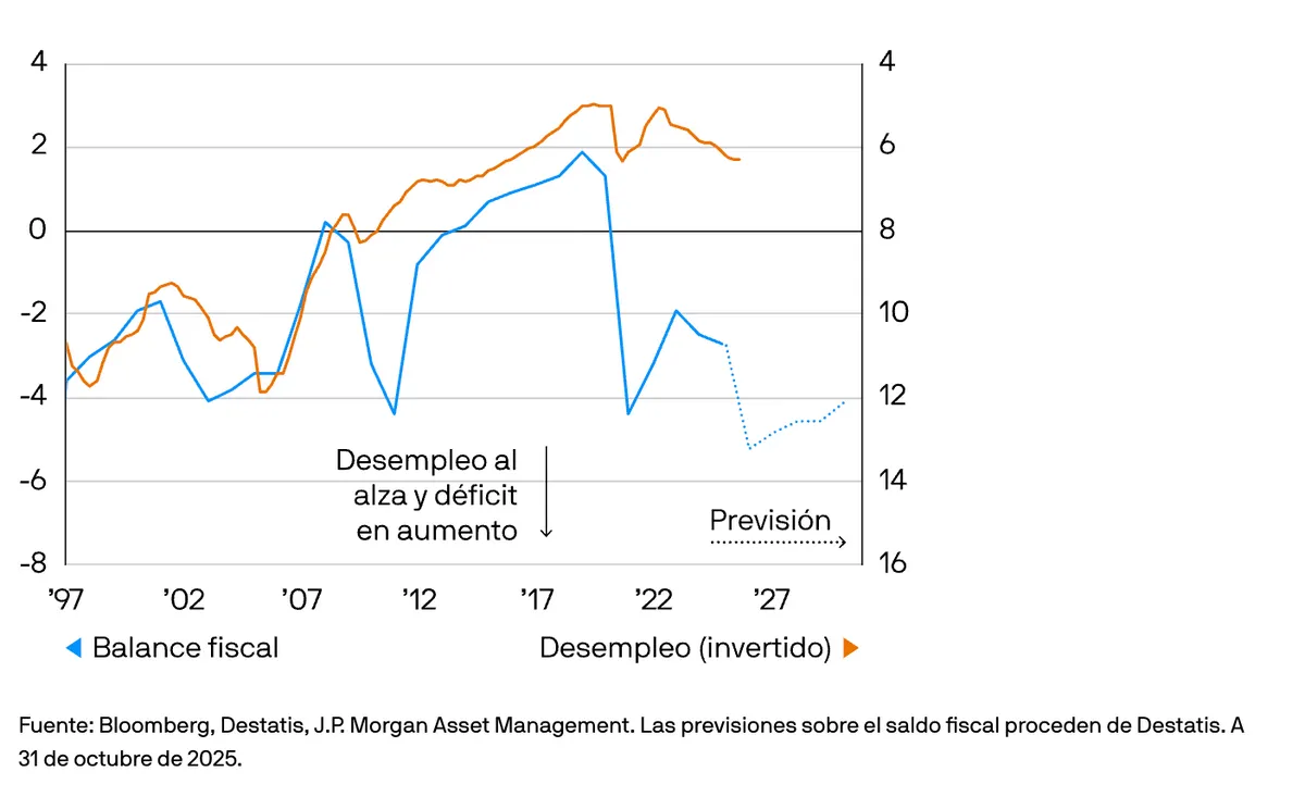 Saldo fiscal y tasa de desempleo de Alemania % del PIB nominal (izda.); % (dcha.)