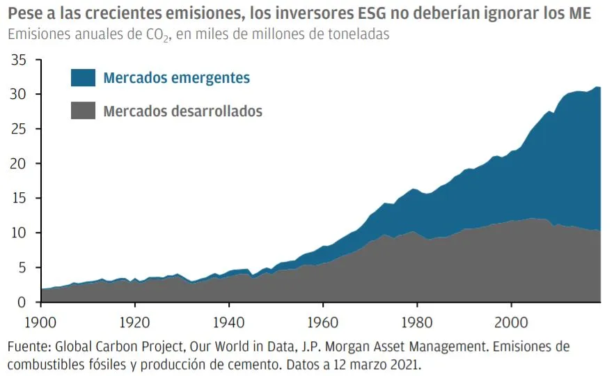 Los mercados emergentes plantean retos particulares en materia ESG. Desde una perspectiva medioambiental, las emisiones de CO2 de las economías emergentes han crecido rápidamente en los últimos años, hasta casi un 70% del total global a día de hoy. Con muchos inversores cada vez más centrados en ESG, estas preocupaciones han llevado a muchos a cuestionarse si la inversión en mercados emergentes debería evitarse.