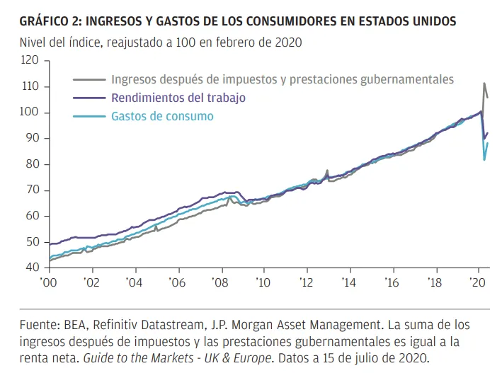 Entre febrero y mayo, los saldos de las tarjetas de crédito de los consumidores cayeron alrededor de un 10% en el Reino Unido y los Estados Unidos, ya que los consumidores pagaron sus deudas. A pesar de la caída de la remuneración de los empleados, la renta neta en los Estados Unidos ha aumentado significativamente como consecuencia de unas prestaciones gubernamentales considerables (gráfico 2).