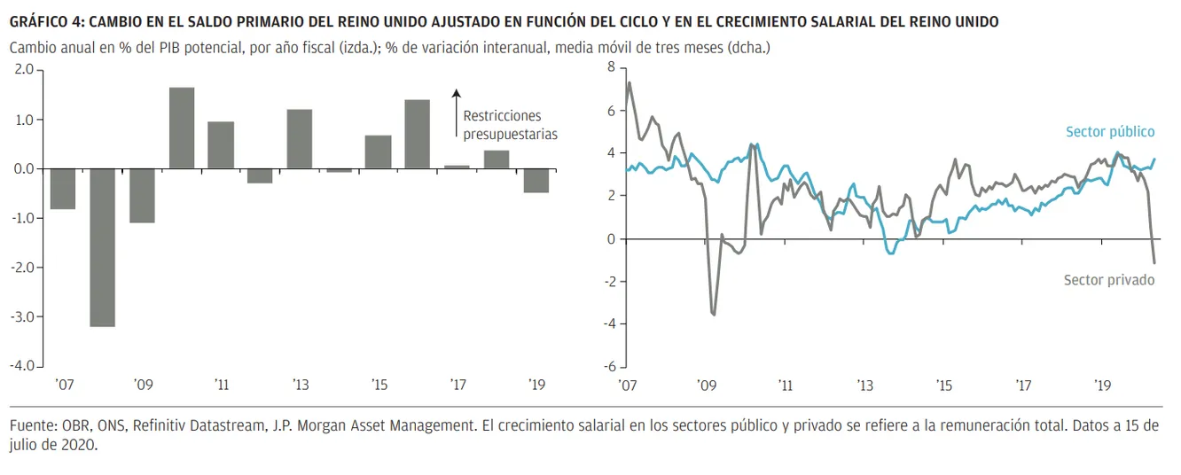 Los consumidores también se habían endeudado enormemente antes de la crisis financiera y, posteriormente, los Gobiernos asumieron deudas aún mayores para sostener el sistema financiero. Esto condujo a un desapalancamiento significativo en el sector de la vivienda y a la austeridad en el sector público. Es muy difícil conseguir que la inflación se ponga en marcha cuando una parte significativa de la población activa que trabaja en el sector público está en situación de congelación salarial (gráfico 4).