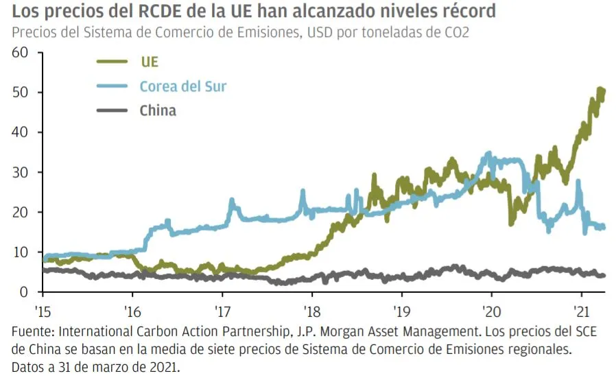 Los precios de los derechos de emisión de CO2 en el Régimen de Comercio de Derechos de Emisión de la Unión Europea (RCDE UE) se han disparado hasta alcanzar niveles récord. Aunque una parte de la reciente subida probablemente refleje la fuerte demanda de derechos de emisión por parte de las empresas para hacer frente a la creciente demanda, las intervenciones normativas también están jugando un papel importante. Como comentamos en nuestro reciente artículo de En la Mente de los Inversores – Implicaciones que las iniciativas de tarificación del carbono tienen para los inversores – los reguladores se enfrentan a un delicada tarea de equilibrio.