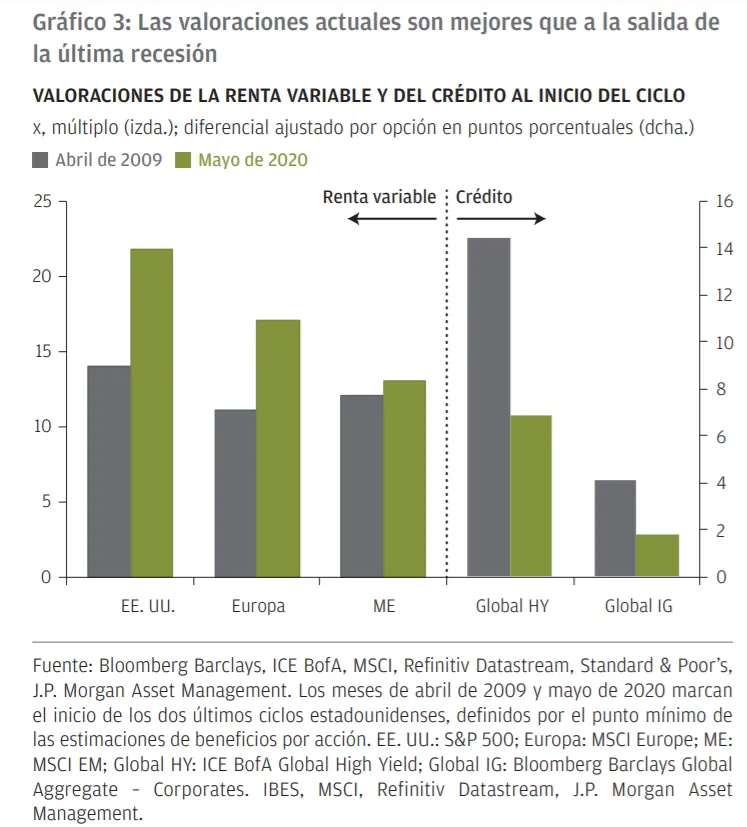 Los inversores tendrán que esforzarse mucho para conseguir que la renta variable de sus carteras les proporcionen las rentabilidades que necesitan. Comenzamos este nuevo ciclo económico con valoraciones más altas de lo habitual en la salida de una recesión (GRÁFICO 3). La caída de los tipos reales ha sido favorable para las valoraciones. Con los tipos de interés más próximos a su suelo nominal, no parece probable que ese tipo de subidas se repitan en los próximos años. Ahora más que nunca, tendrá que hacerse hincapié en identificar las regiones, los sectores y las compañías con las perspectivas de beneficios empresariales más sólidas e infravaloradas.