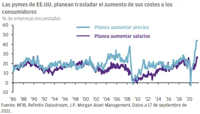 Los datos de una encuesta reciente de la Federación Nacional de Empresas Independientes muestran que las pequeñas empresas de EE.UU. tienen previsto subir los precios, debido al contexto de fuerte demanda y oferta limitada en que se encuentran. A muchas empresas les está costando contratar personal y las ofertas de empleo alcanzan niveles record. Esta aparente escasez de mano de obra está obligando a las empresas a aumentar los salarios para atraer y retener a los trabajadores. Esto, combinado con el aumento de los costes de las materias primas y la logística, está presionando al alza los costes de los inputs. Sin embargo, la solidez de la demanda de los consumidores en relación con lo que las empresas pueden ofrecer implica que se encuentran lo suficientemente cómodas como para trasladar estos costes a sus clientes. Mientras las empresas puedan seguir aumentando los ingresos a mayor velocidad que los precios de los inputs, los beneficios continuarán mejorando.