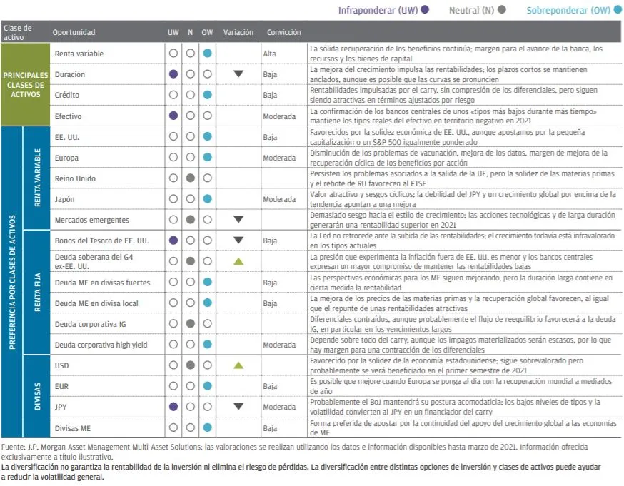 Las opiniones sobre las clases de activos son aplicables a un horizonte temporal de 12-18 meses. Las flechas arriba/abajo indican un cambio positivo o negativo en la reflexión con respecto a la anterior Cumbre de Estrategia trimestral. Estas opiniones no se deberán interpretar como recomendaciones para la cartera. Este resumen de nuestras opiniones sobre las clases de activos individuales indica la fortaleza de la convicción y las preferencias relativas en toda una amplia gama de activos, pero es independiente de las consideraciones para la construcción de carteras.