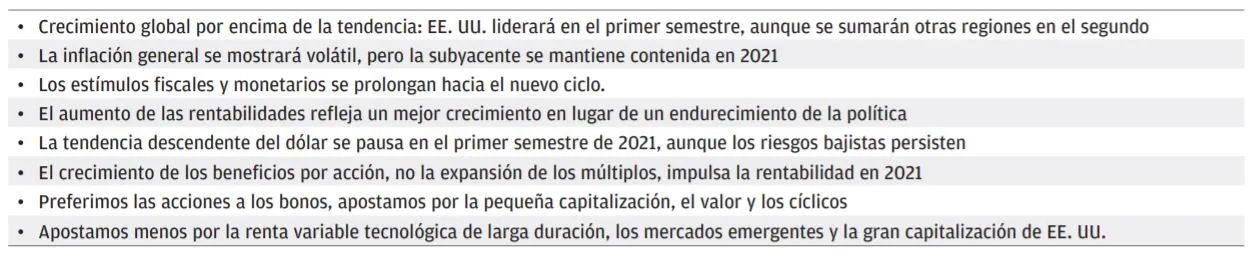 En general, nuestras carteras están posicionadas para un crecimiento por encima de la tendencia, un aumento de las rentabilidades y una recuperación de los beneficios cíclicos. Los principales riesgos son una retirada injustificada de los estímulos políticos que se interponga en la senda de la recuperación, una cautela injustificada de los consumidores a medida que las economías se reabran o un nacionalismo de las vacunas agravado que desemboque en conflictos comerciales más generalizados. Sin embargo, nuestra principal hipótesis sigue siendo una sólida recuperación y un avance rápido de la economía hacia la parte media del ciclo, así como unos mercados de activos que continúen registrando avances moderados, a pesar de que requieran un enfoque más selectivo que el pasado año.