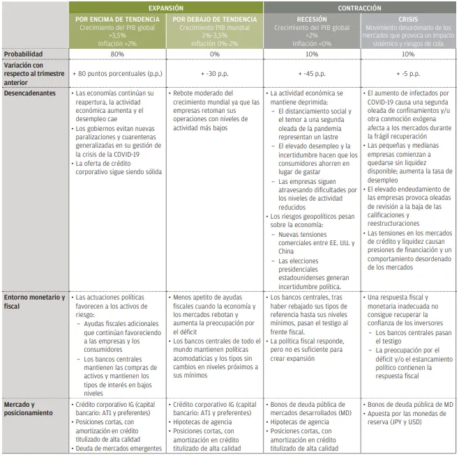 Cada trimestre, un equipo de gestores de carteras y especialistas sectoriales de la plataforma de renta fija global, divisas y materias primas de J.P. Morgan se reúne para formular nuestra visión de consenso a corto plazo (tres-seis meses) sobre los mercados de renta fija A lo largo de una jornada, revisamos el entorno macroeconómico y analizamos cada sector en base a tres parámetros clave: fundamentales, valoraciones cuantitativas y factores técnicos (oferta y demanda). La tabla siguiente resume nuestras perspectivas en diversos escenarios potenciales, la probabilidad que le asignamos a cada uno de ellos, así como sus implicaciones macroeconómicas, financieras y de mercado.
