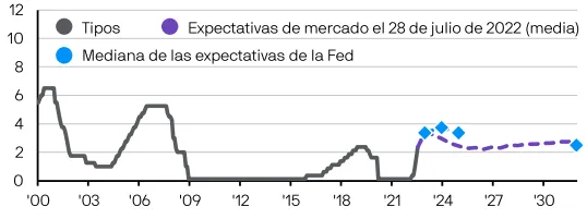 Fuente: Bloomberg, US Federal Reserve, J.P. Morgan Asset Management. Las expectativas de mercado se calculan usando OIS forwards. La proyección a más largo plazo representa la mediana de evaluación del comité de donde se espera que converja el tipo de los fondos federales en virtud de la política monetaria adecuada y en ausencia de más impactos para la economía. Datos a 28 de julio de 2022.