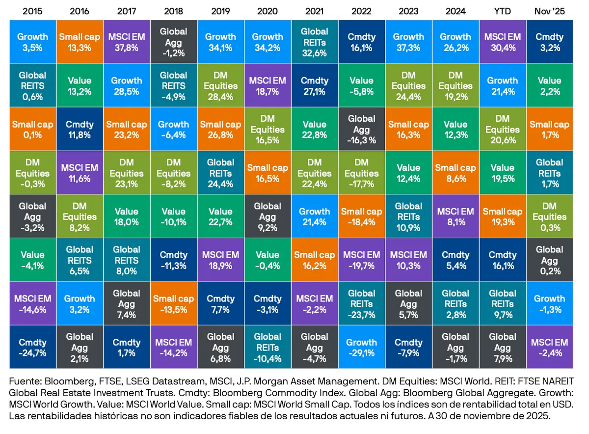 El presente documento es una publicación con carácter general y fines exclusivamente informativos. Su naturaleza es divulgativa y no ha sido diseñado para servir como asesoramiento ni recomendación sobre ningún producto o estrategia de inversión específico ni sobre características de planes concretos u otro material en ninguna jurisdicción. Por tanto, ni J.P. Morgan Asset Management ni ninguna de sus filiales poseen compromiso alguno de participar en ninguna de las transacciones mencionadas en este documento. Los ejemplos utilizados tienen carácter genérico o hipotético y se facilitan exclusivamente con fines ilustrativos. Dado que esta publicación no contiene información suficiente para respaldar una eventual decisión de inversión, no deberá basarse en ella para evaluar las ventajas de invertir en ninguno de los valores o productos mencionados en ella. Asimismo, los usuarios deben evaluar de manera independiente las consecuencias legales, reglamentarias, fiscales, crediticias y contables, y determinar, junto con sus propios asesores profesionales, si alguna de las inversiones aquí mencionadas se considera adecuada para alcanzar sus propios objetivos personales. Los inversores deberán asegurarse de que obtienen toda la información relevante disponible antes de realizar cualquier inversión. Las previsiones, cifras, opiniones o técnicas y estrategias de inversión aquí reflejadas se ofrecen exclusivamente para fines informativos, sobre la base de ciertos supuestos y las condiciones actuales de mercado, y están sujetas a cambios sin previo aviso. Toda la información aquí incluida se considera exacta en el momento en que se ha elaborado, pero no se ofrece ninguna garantía de exactitud y no se acepta ninguna responsabilidad en relación con cualquier error u omisión. Cabe señalar que la inversión conlleva riesgos, que el valor de las inversiones y las rentas que estas generan pueden fluctuar en función de las condiciones del mercado y los convenios en materia tributaria, y que los inversores podrían no recuperar todo el dinero invertido. Ni la rentabilidad histórica ni las tires son indicadores fiables de los resultados actuales ni futuros. J.P. Morgan Asset Management es la marca del negocio de gestión de activos de JPMorgan Chase & Co. y sus filiales en todo el mundo. En la medida permitida por la legislación aplicable, J.P. Morgan Asset Management podría grabar las llamadas telefónicas y supervisar las comunicaciones electrónicas a fin de cumplir sus políticas internas y obligaciones legales y normativas. J.P. Morgan Asset Management recopilará, almacenará y tratará todos los datos personales de conformidad con nuestras políticas de privacidad, las cuales están disponibles en am.jpmorgan.com/global/privacy. Esta comunicación ha sido publicada por las siguientes entidades: En los Estados Unidos, por J.P. Morgan Investment Management Inc. o J.P. Morgan Alternative Asset Management, Inc., ambas reguladas por la Comisión de Bolsa y Valores. En América Latina, solo para uso por parte de beneficiarios concretos, por entidades locales de J.P. Morgan, según proceda. En Canadá, solo para uso por parte de clientes institucionales, por JPMorgan Asset Management (Canada) Inc., que es una Gestora de Carteras registrada y un Agente de Mercado Exento en todas la provincias y territorios de Canadá, salvo Yukón, y también está registrada como Gestora de Fondos de Inversiones en Columbia Británica, Ontario, Quebec y Terranova y Labrador. En el Reino Unido, por JPMorgan Asset Management (UK) Limited, que está autorizada y regulada por la Financial Conduct Authority; en otras jurisdicciones europeas, por JPMorgan Asset Management (Europe) S.à r.l. En Asia Pacífico (APAC), por las siguientes entidades emisoras y en las respectivas jurisdicciones en las que están principalmente reguladas: JPMorgan Asset Management (Asia Pacific) Limited, JPMorgan Funds (Asia) Limited o JPMorgan Asset Management Real Assets (Asia) Limited, todas ellas reguladas por la Securities and Futures Commission de Hong Kong. JPMorgan Asset Management (Singapore) Limited (n.º de reg. de la sociedad: 197601586K), si bien esta promoción o publicación no ha sido revisada por la Monetary Authority of Singapore, el organismo regulador del mercado en Singapur. JPMorgan Asset Management (Taiwan) Limited. JPMorgan Asset Management (Japan) Limited, que es miembro de la Investment Trusts Association, Japan (JITA); la asociación de asesores de inversión de Japón (Japan Investment Advisers Association), la Type II Financial Instruments Firms Association y la Japan Securities Dealers Association, y está regulada por la Agencia de Servicios Financieros de Japón (número de registro «Kanto Local Finance Bureau [Financial Instruments Firm] No. 330»). En Australia, por JPMorgan Asset Management (Australia) Limited (ABN 55143832080) (AFSL 376919) y solo para clientes mayoristas (wholesale clients) tal y como se indica en las secciones 761A y 761G de la ley de sociedades Corporations Act de la Commonwealth de 2001. En el resto de los mercados de Asia Pacífico, el documento solo está dirigido a los destinatarios previstos. Solo para EE. UU.: Si es usted una persona con una discapacidad y necesita ayuda adicional para ver el material, llámenos al 1-800-343-1113 para solicitar ayuda.