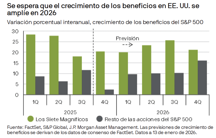 La semana pasada comenzó en Estados Unidos la temporada de resultados del cuarto trimestre de 2025, con la publicación de informes de los principales bancos y algunas aerolíneas. Los inversores están siguiendo de cerca no solo los resultados, sino también lo que los equipos directivos comentan sobre la situación del consumidor y el impacto de la continua incertidumbre política por parte de la administración estadounidense. Hasta ahora, los resultados han estado en línea con las expectativas en términos generales, pero el tono de los directivos ha sido más cauteloso de lo esperado. Como muestra el gráfico, se espera que el crecimiento de los beneficios se amplíe este año y no se concentre solo en las "Siete Magníficas", la mayoría de las cuales presentarán resultados más adelante este mes. En Europa, los analistas proyectan una sólida recuperación de los beneficios este año tras un 2025 decepcionante. Esta diversificación del crecimiento de los beneficios refuerza la importancia de diversificar no solo dentro de la renta variable estadounidense, sino también a nivel global.