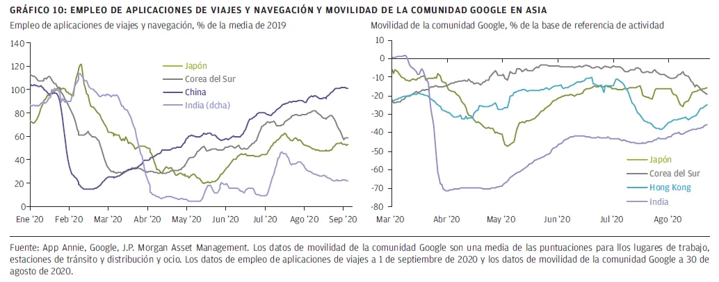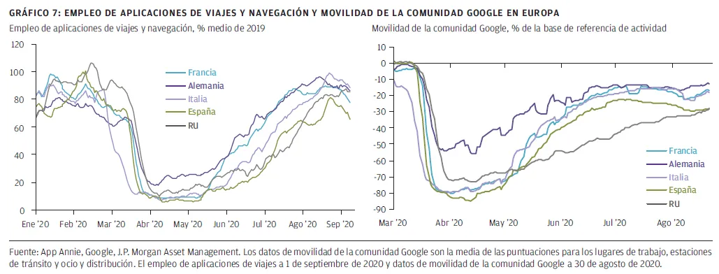 Los gráficos muestran el nivel de actividad en relación con una base de referencia calculada a partir de un periodo de cinco semanas a comienzos de este año.