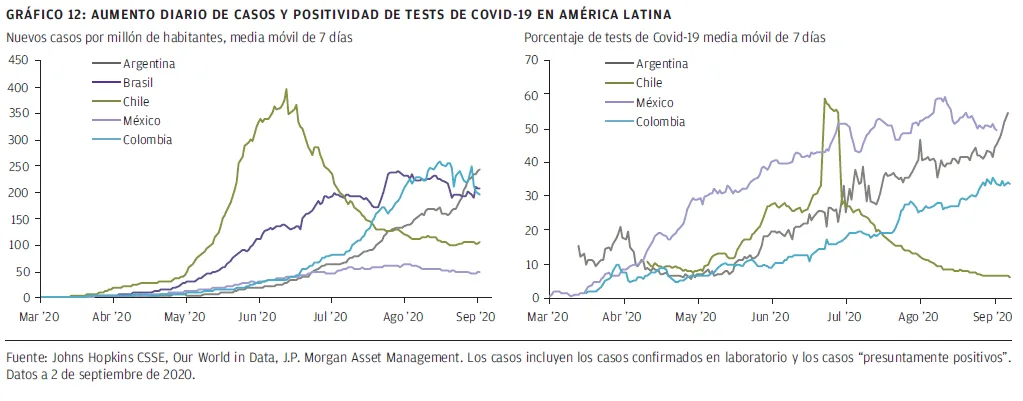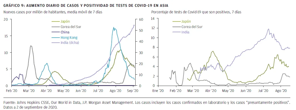 Por lo tanto, estamos observando de cerca tanto el crecimiento de nuevos casos como los ratios de positividad de los tests de cada país, para entender cómo está evolucionando la prevalencia del virus. Un ratio de positividad de los tests bajo indica que un país está llevando a cabo un gran número de tests en relación con el número de contagios de la comunidad. Esto significa que hay una buena comprensión de quién tiene exactamente el virus y que se contendrán con más facilidad las próximos brotes desde estos niveles.