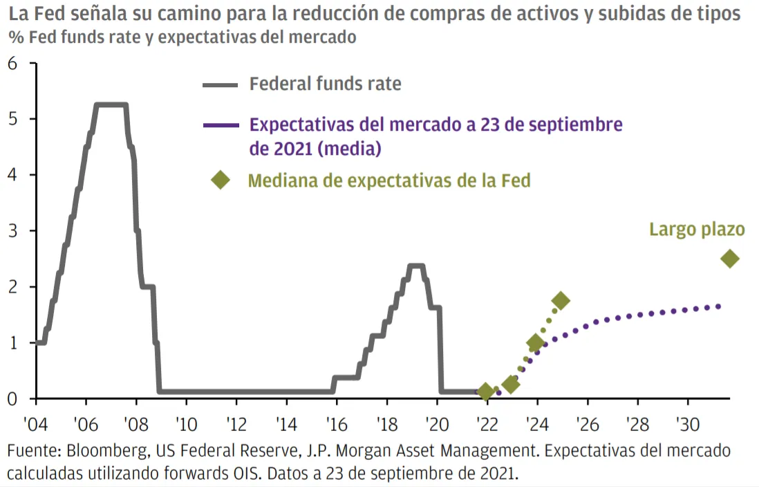 La Reserva Federal de los Estados Unidos (Fed) actualizó su 'diagrama de puntos', que indicaba que una primera subida de tipos podría producirse el próximo año y afirmó que una reducción en las compras de activos "se autorizaría pronto". Esperamos que "pronto" signifique que la reducción se anunciará en noviembre y finalizará a mediados del 2022.