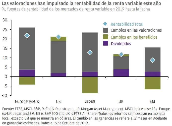 Por el contrario, la evolución de las valoraciones ha sido responsable de la mayoría de la rentabilidad. Los analistas aún esperan una elevada tasa de crecimiento del 10% para los beneficios corporativos a nivel global en 2020, a pesar de las complicaciones en el escenario macro. Con las valoraciones en muchos mercados que ya reflejan expectativas elevadas para una mayor flexibilización por parte de los bancos centrales, las revisiones a la baja de las expectativas de beneficios podrían representar un riesgo para las rentabilidades de los mercados de renta variable en los próximos meses.