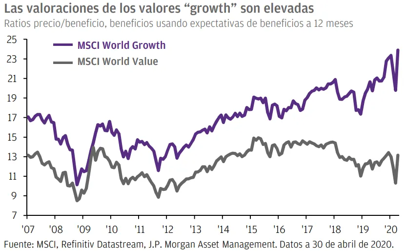 Los valores growth se han comportado mejor que los value durante esta recesión, ya que muchos inversores creen que las grandes compañías tecnológicas y los negocios online van a ser más resilientes, dado que la gente trabaja y compra desde casa.