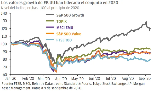 Los valores growth de EE.UU han sido los que mejor se han comportado hasta la fecha. Las acciones value estadounidenses y otros índices del mercado de renta variable, que contienen menos valores growth y de tecnología, han tenido una rentabilidad menor, lo que se ajusta más al perfil de la recuperación económica.