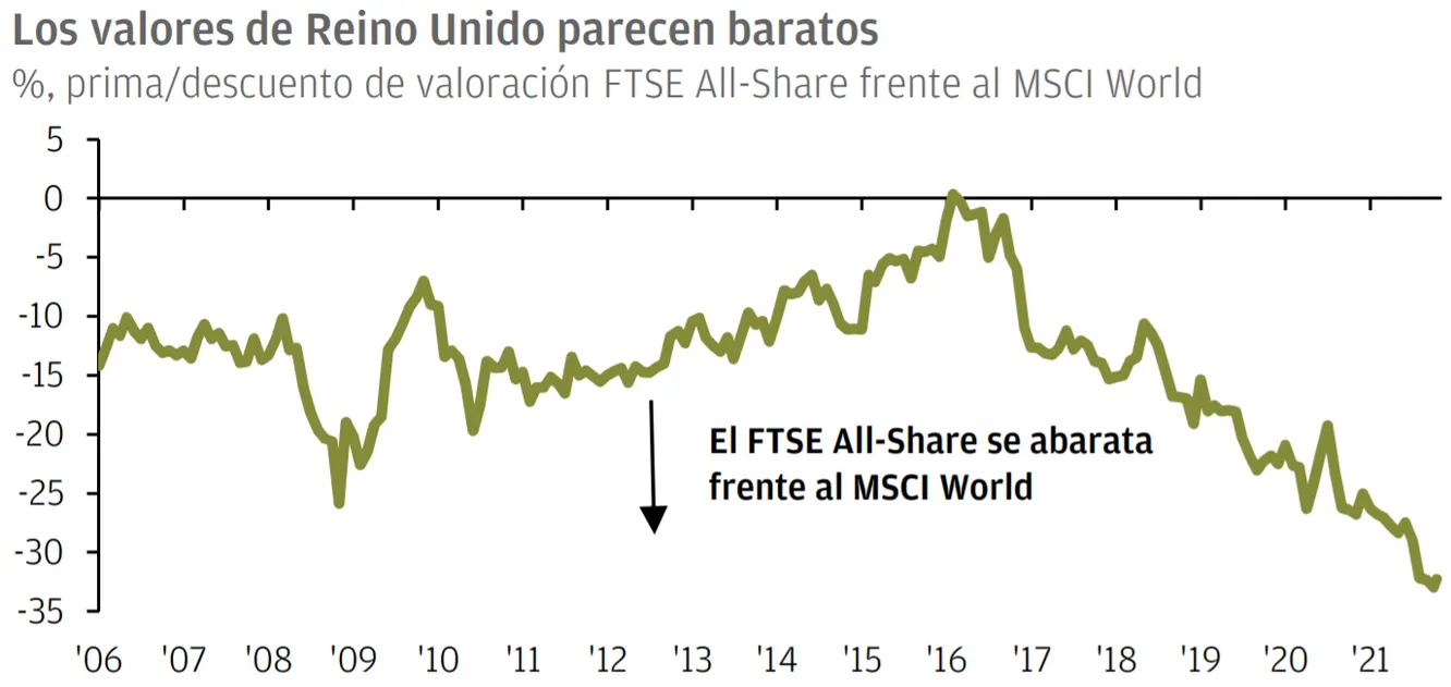 Los valores del Reino Unido parecen estar baratos en comparación con sus equivalentes internacionales y con respecto a su larga historia, lo que proporciona un punto de entrada potencialmente atractivo para los inversores a largo plazo. Como comentamos en nuestro reciente artículo de On the Minds of Investors, llamado “la renta variable de Reino Unido ofrece valor”, las perspectivas económicas del país parecen prometedoras, ya que se espera que el PIB real crezca más de un 5% el próximo año. Los consumidores en conjunto tienen muchos ahorros acumulados de la pandemia y las encuestas sobre las intenciones de inversión empresarial han mejorado considerablemente. Se podría esperar que estas sólidas perspectivas económicas ya se hayan incluido en los precios de los mercados, pero al comparar el PER del FTSE All-Share con los mercados desarrollados (MSCI World), el índice del Reino Unido cotiza con un descuento de valoración casi récord. A medida que el fuerte crecimiento económico eleve los beneficios empresariales, los valores de Reino Unido deberían verse beneficiados.