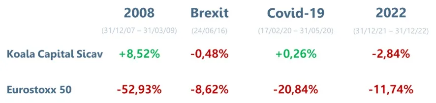 Igual que en otras crisis de mercados, como la del año 2008, la crisis del euro de verano de 2011, el Brexit de junio de 2016, la Covid-19 de marzo de 2020 o este año 2022, Koala Capital Sicav ha tenido un comportamiento muy resiliente, consiguiendo su principal objetivo, la preservación del capital.