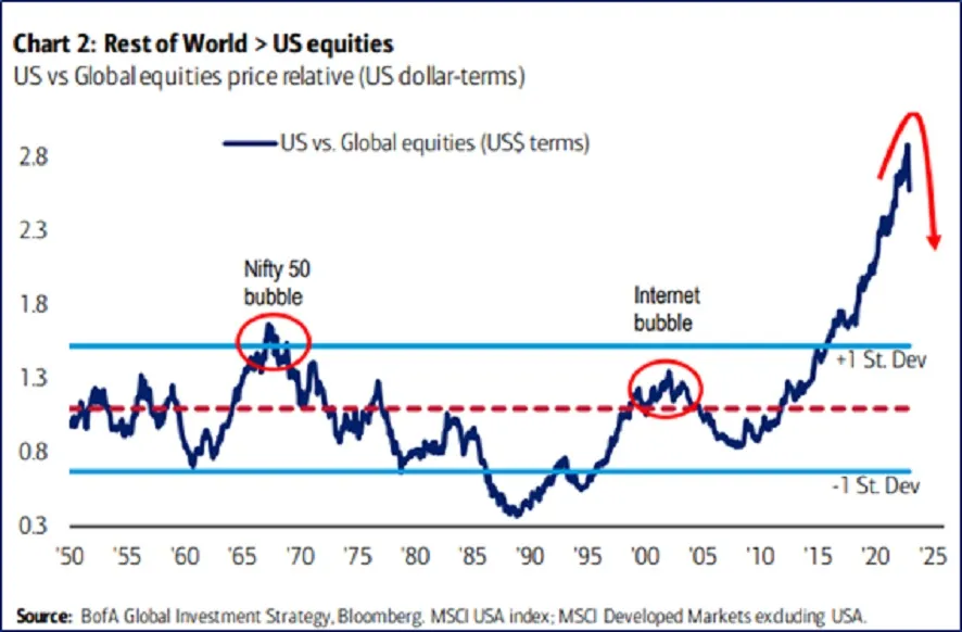 En los últimos setenta años, las cotizaciones de las bolsas del resto del mundo se han comportado mejor que la norteamericana durante la mayor parte del tiempo, especialmente durante los decenios de los 70 y 80. En cambio en estos últimos diez años hasta 2021, el mejor comportamiento relativo de las acciones norteamericanas ha sido aplastante. El nacimiento de las mejores empresas tecnológicas de la historia (las FANG), junto al incremento en la gestión pasiva han atraído gran parte de los flujos de ahorro globales. La mayoría de los inversores europeos o asiáticos han desviado sus ahorros al S&P 500 e incluso al Nasdaq, o a vehículos o instrumentos como ETF en empresas de innovación, desencadenando una burbuja histórica en el 2021. En 2022 hemos visto un cambio brusco. Los peores índices han sido los norteamericanos, con el Nasdaq a la cabeza (-33,1%), y el S&P 500 perdiendo el -19,4%. Los principales índices europeos han sufrido caídas de dobles dígitos bajos. La bolsa japonesa, en cambio, ha sufrido pérdidas de un solo dígito. ¿Podríamos estar al inicio de un cambio de tendencia, con un mejor comportamiento de las bolsas del resto del mundo en relación con la norteamericana?