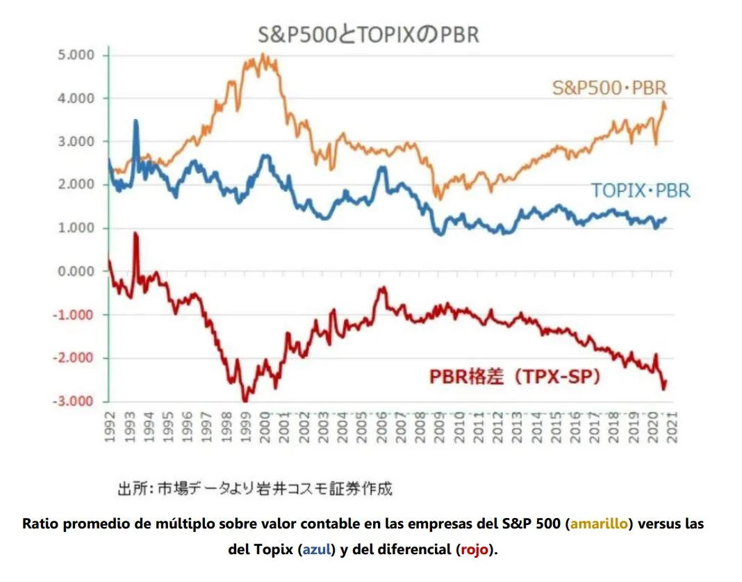 Si comparamos niveles de valoración entre distintos mercados podremos comprobar como el precio respecto valor en libros, una ratio tan simple como ilustrativa, nos muestra como el conjunto de empresas del índice Topix cotizan a una ratio de 1, algo inaudito a nivel global. Eso significa que no estás pagando nada por los beneficios futuros ni por el fondo de comercio de las empresas. De hecho, las empresas del índice S&P 500 cotizan a 4 veces su valor en libros. Al igual que con la valoración por múltiplos de su flujo de caja neto, el diferencial de valoración se ha ampliado estos años a favor del mercado japonés (ver el siguiente gráfico).