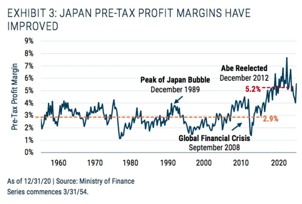 En el trimestre anterior comentábamos como diversos inversores legendarios estaban iniciando inversiones en acciones japonesas. En marzo, GMO, la gestora de fondos de inversión de Boston acaba de publicar un documento especial sobre la gran oportunidad de inversión en la bolsa japonesa y más concretamente en las llamadas empresas de valor o “value”. La disminución del endeudamiento y la reducción de costes laborales por la jubilación de sus directivos mejor pagados ha contribuido a la mejora de los márgenes empresariales, que se han duplicado respecto al pico alcanzado en la burbuja de los años noventa.