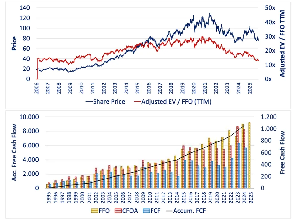Tras muchos años siguiendo la compañía, no fue hasta el verano de 2025 que iniciamos nuestras primeras compras de acciones. Aunque los precios actuales se sitúan en niveles similares a 2018, su múltiplo de valoración refleja niveles de 2006-2007, debido a que la generación de caja no ha dejado de crecer, acelerándose desde 2015 (ver gráfico inferior).