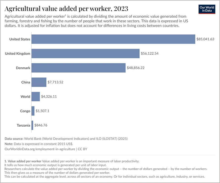 Un ejemplo ilustrativo: ¿cómo es posible que el valor añadido generado por un agricultor en Estados Unidos sea el doble del de un agricultor en Dinamarca, once veces superior al de un agricultor en China y más de cincuenta y seis veces mayor que el de uno en la República del Congo, pese a que este último país cuenta con condiciones naturales mucho más favorables para la agricultura? La respuesta es el nivel de inversión y el consecuente aumento de productividad.