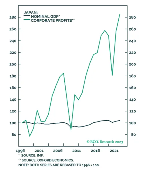 Evolución del PNB nominal en Japón (en negro) y de los beneficios empresariales (en verde). Fuente: BCA Research.