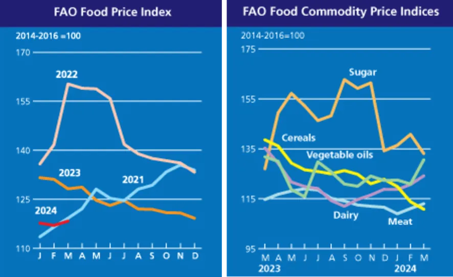 Índices de Precios agrícolas en el primer trimestre versus años anteriores, e Índices de Precios agrícolas y ganaderos mundiales en los últimos doce meses (fuente: FAO)