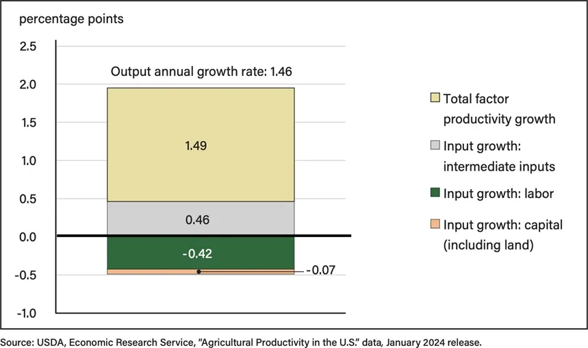 Fuentes del informe: “Measurement of Output, Inputs, and Total Factor Productivity in U.S. Agricultural Productivity Accounts” de agosto de 2024.