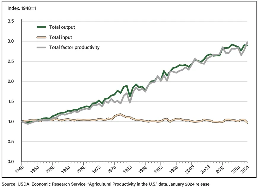 En valores absolutos, la producción agrícola y ganadera total en 2021 fue aproximadamente 2,9 veces superior a la de 1948. Las mejoras en la genética animal y vegetal, en fertilizantes y pesticidas, así como posibles mejoras organizativas y en el trabajo, permitieron a los Estados Unidos alcanzar “la seguridad alimentaria”, lo que a su vez les ha posicionado como exportadores netos durante decenios.