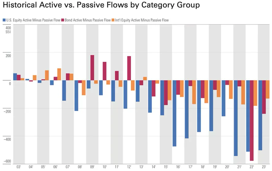 Entre 2007 y 2015 en Estados Unidos, los flujos mostraban un impacto de aproximadamente $150.000 millones anuales entre la salida de los fondos de inversión de gestión activa y entrada en los de gestión pasiva. A partir de 2016 y hasta 2019, esta tendencia se intensificó, y el promedio anual de estos movimientos financieros alcanzó los $300.000 millones. Desde 2021, estos flujos han superado los $500.000 millones cada año. Este fenómeno de concentración de mercado se ha acelerado notablemente desde 2016. Estos datos corresponden solo al mercado norteamericano, pero donde se producen más salidas es en el resto de los mercados bursátiles.