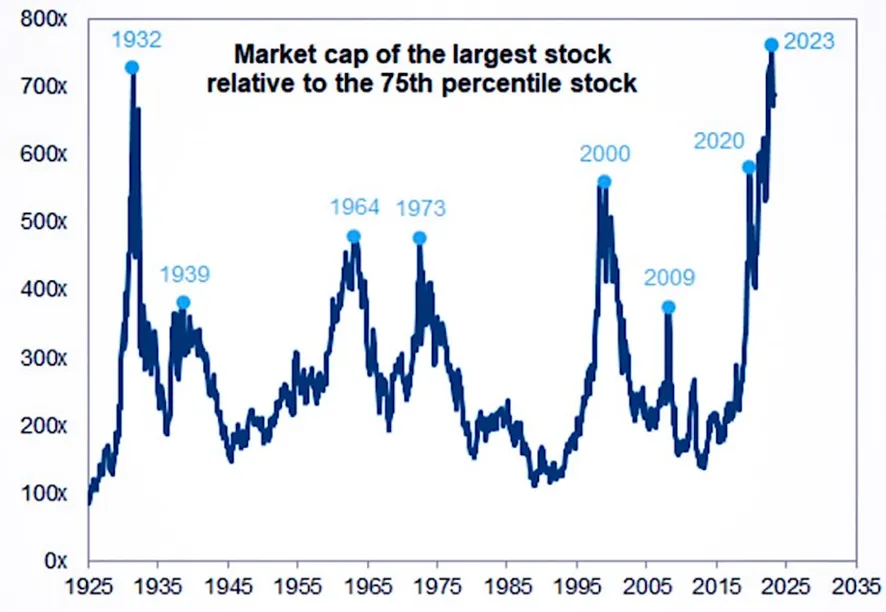 Periodos de extrema concentración en la historia bursátil del último siglo. Tamaño de la mayor acción en relación con el tamaño promedio del percentil 75, fuente (Goldman Sachs Research).