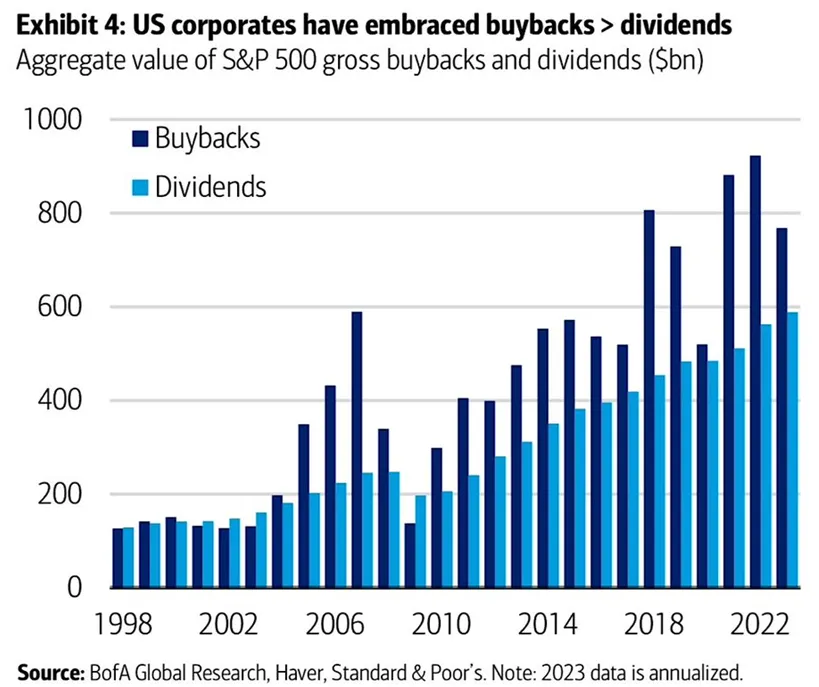 Otra variable tectónica son las recompras de acciones por parte de las propias compañías que suponen unos $800.000 millones anuales en Estados Unidos, mas del 70% de todas las realizadas en el mundo. En Europa el total de recompras en 2023 fue de $146.000 millones. En los últimos tres años, entre las recompras de acciones y los flujos derivados de la gestión pasiva, las acciones norteamericanas han recibido flujos compradores por valor de 1,3 trillones anuales (anglosajones), un autentico huracán inversor.