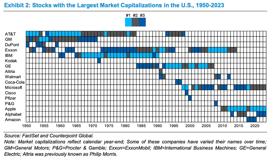 Únicamente una empresa ha sobrevivido siete decenios en el trono de empresas con mayor capitalización bursátil. La petrolera Exxon Mobil Corp. lo ha conseguido al no existir aún una tecnología alternativa a los motores de combustión. También por integrar a múltiples competidores, aunque ninguna empresa ha conseguido permanecer a lo largo de un siglo entre las de mayor capitalización.