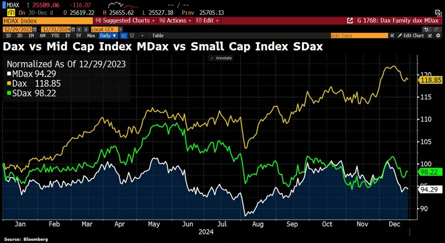 Evolución divergente en los índices bursátiles alemanes en 2024. Grandes empresas (Dax, amarillo), medianas (MDax, blanco) y pequeñas (SDax, verde). Fuente: Bloomberg.