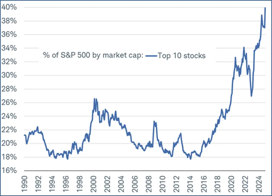 A finales de 2024, las 10 mayores compañías por capitalización pesaban el 40% del índice S&P 500 y el resto de 490 empresas, el 60% restante. Este es el mayor nivel de concentración jamás registrada en los últimos 50 años. En comparación, durante el pico de 1972 (el mercado de las Nifty Fifty), las 10 mayores empresas suponían un 34%, y en la burbuja de internet en el año 2000, un 26%. Históricamente la combinación de altos niveles de concentración junto a un movimiento acelerativo ha coincidido con máximos en el mercado.