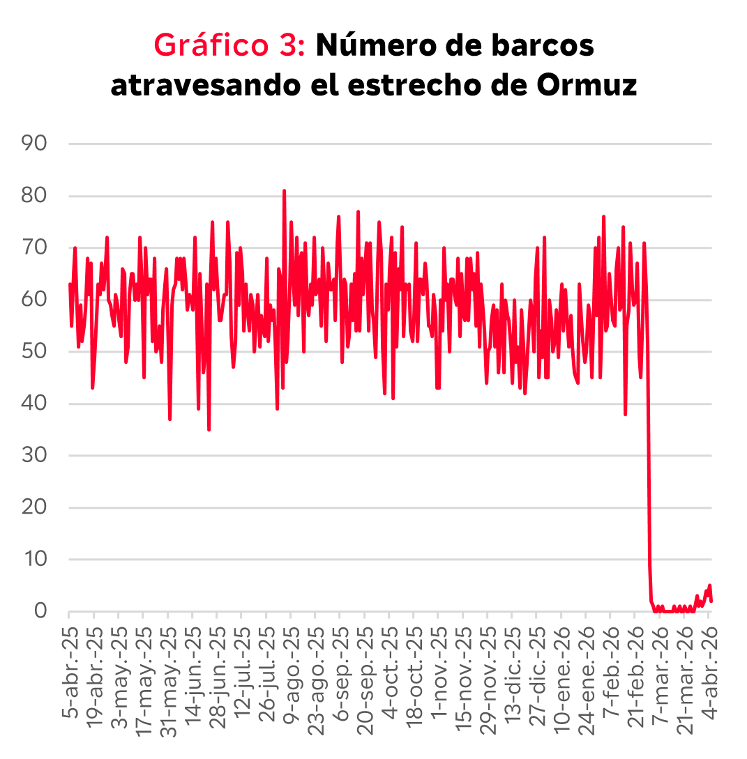 La volatilidad en los mercados fue (y continúa) siendo alta dado que el sentimiento oscila entre episodios de alta aversión al riesgo cuando el conflicto parece escalar de tensión y rápidos rebotes si aparecen signos de avances en las negociaciones de paz. El precio del petróleo llegó a superar los 115 dólares por barril aunque en promedio, la cotización se sitúo alrededor de los 100 USD (lo que supone una subida mensual del 60% y uno de los mayores shocks de las últimas décadas). El cierre impuesto por Irán del estrecho de Ormuz impide que por este enclave estratégico discurran 20 millones de barriles de petróleo al día y aproximadamente un 20% del gas natural licuado mundial, lo que mantiene tensionados los mercados energéticos que, unido a los ataques a infraestructuras del Golfo, podría empezar a provocar situaciones de falta de suministro en empresas y hogares si el bloqueo continúa. Las medidas anunciadas para intentar aumentar la oferta (levantamiento de las sanciones al gas y petróleo ruso, la liberación de reservas estratégicas por parte del G-7 o el reciente aumento de producción por parte de la OPEP) son tan solo soluciones temporales que compensan en parte la caída del tráfico marítimo por el estrecho.