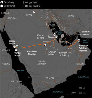 - El oleoducto de Yanbu (Arabia Saudí) está siendo capaz de transportar alrededor de 4,6 millones de barriles diarios mientras que el de Fujairah (EAU) libera 3,1 millones del estrecho de Ormuz.