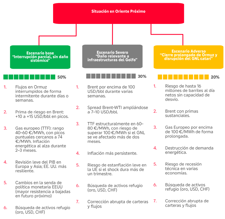 - Escenario severo (20%): Cierre prolongado del estrecho de Ormuz y/o daños a las instalaciones de Gas Natural Licuado en Qatar