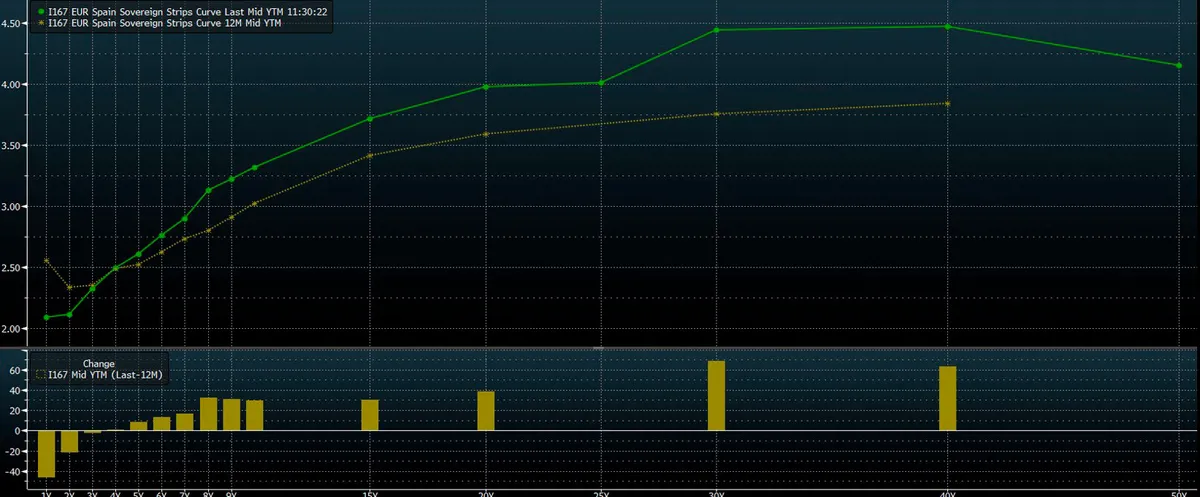 Actualmente (a 24 de noviembre de 2025), la curva de tipos en España mantiene una pendiente positiva (normal), aunque con una moderación notable en los tramos intermedios. Por ejemplo, el rendimiento del bono español a 3 años se sitúa en torno al 2,18%. El bono a 5 años ofrece aproximadamente 2,49%. Por su parte, el bono a 10 años español tiene una rentabilidad cercana al 3,17%–3,23%.