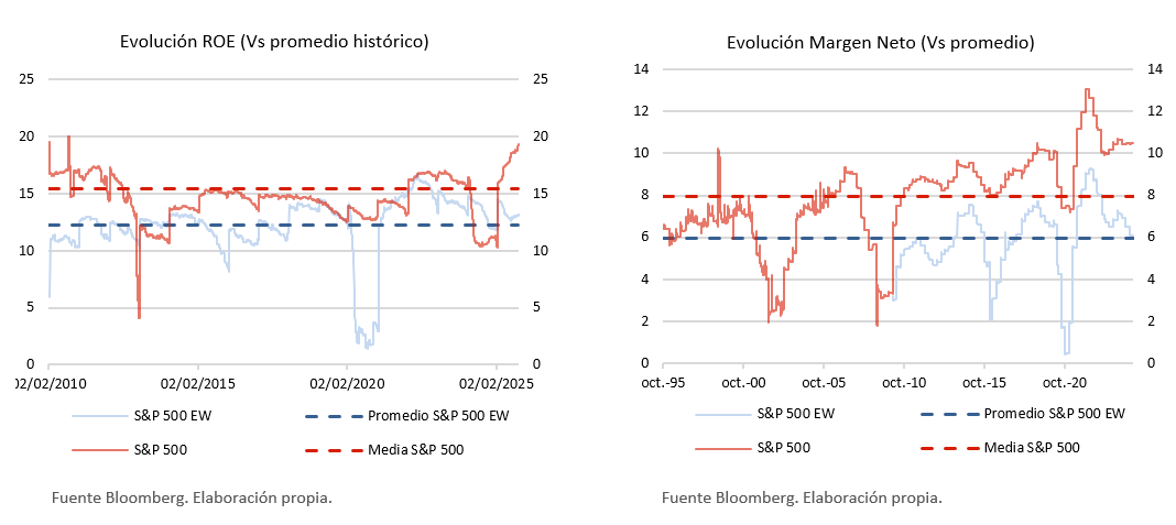 Con estos nuevos datos es evidente que las conclusiones deben cambiar. Tanto ROE como márgenes están por encima de su media histórica y con previsión de seguir mejorando. Además, también se puede concluir que el índice capitalizado cuenta con retornos y márgenes mucho más amplios que el mercado general, por ponerlo en números, S&P 500: ROE del 19% (+22% de prima) y Margen del 11% (+42% de prima); mientras que el mercado (S&P 500 EW): ROE del 13% (+7,37% de prima) y Margen del 6,32% (+6% de prima).