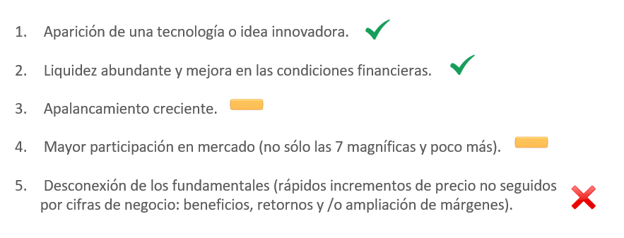 Respecto de la inteligencia artificial, hay que estar atentos a lo que vaya ocurriendo entorno a su desarrollo, puesto que de este asunto va a depender que acabemos en una burbuja o no. Actualmente llevamos apenas 2 años en la carrera por dominar esta nueva tecnología, se podría decir que aún nos queda recorrido en cuanto al volumen de inversión que se debe llevar a cabo y el número de participantes que irán sumándose. El hecho de que se trate de una tecnología transformadora y que este atrayendo mucho capital, es precisamente lo que nos obliga a estar atentos a su evolución, debido a que estas han sido características que también hicieron aparición en otros mercados que acabaron en burbuja. Enumeramos aquí algunas de los rasgos comunes que suelen darse en estos mercados, son: