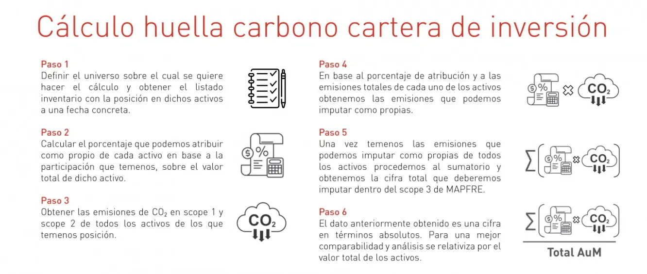 MAPFRE AM dispone de una metodología propia para el cálculo de la huella de carbono en la cartera de inversión, que trata de complementar los cálculos ya establecidos a nivel regulatorio y establece diferentes tipos de medición de la huella de carbono sobre las inversiones en función de la información que se quiera reportar y la finalidad de la misma. De hecho, de manera resumida, se pueden establecer cálculos en términos absolutos, relativos y de intensidad ponderados.
