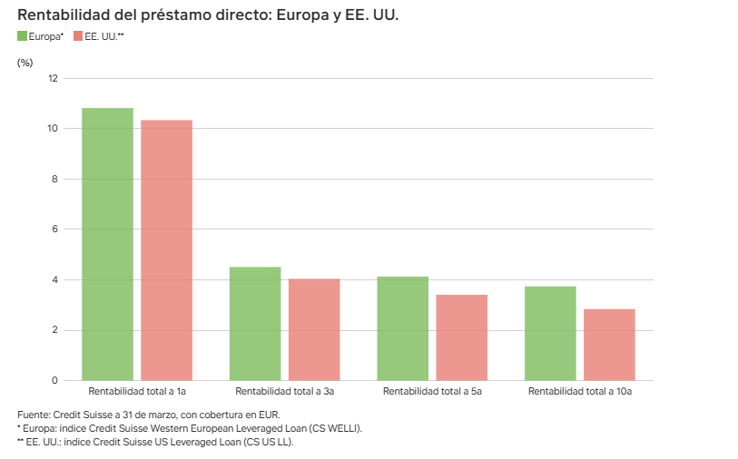 Una mayor madurez suele afectar a las principales características de riesgo y rentabilidad. La gran competencia en el mercado estadounidense suele reducir la TIR disponible para los inversores. Utilizando el préstamo directo como indicador, podemos ver que el mercado europeo de crédito no cotizado ha ofrecido una mayor rentabilidad histórica que el americano.