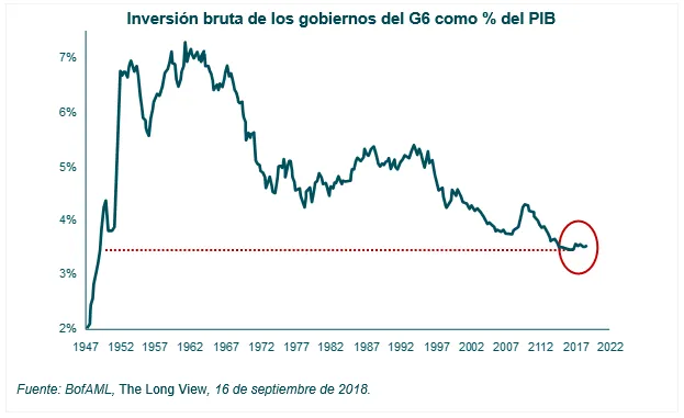 En el mundo desarrollado, el gasto en el cuidado, mantenimiento y expansión necesarios para que nuestra estructura existente siga siendo adecuada ha sido lamentablemente insuficiente, con lo que nuestros activos críticos se hallan en un estado precario. Esto es algo que podemos observar en nuestra vida cotidiana. La inversión en infraestructura en los países del G6 —Estados Unidos, Canadá, el Reino Unido, Alemania, Francia y Japón— lleva varias décadas disminuyendo, y el 3,5% del PIB de hoy en día representa el nivel más bajo desde 1948 (Gráfico 1). El actual mínimo de los últimos 70 años es la mitad del pico alcanzado en los años sesenta, lo cual también revela el envejecimiento de estos activos. Dada la presión a la que están sometidas las finanzas gubernamentales y los conocimientos y experiencia limitados en el ámbito público, el sector privado jugará un papel significativo en la restauración y mejora de nuestra infraestructura crítica.