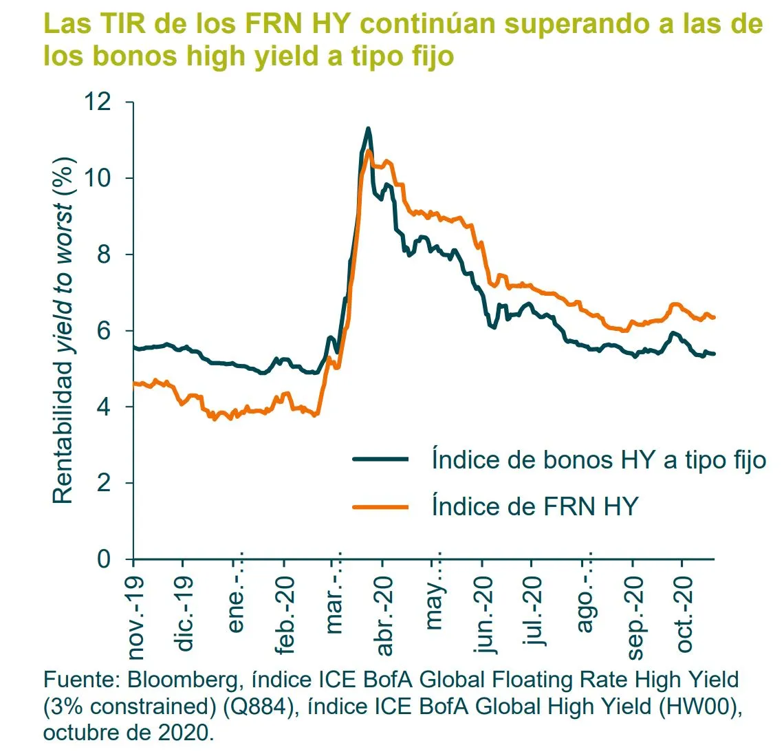 Como puede verse en el gráfico, el mercado de FRN HY todavía ofrece una TIR superior a la de su homólogo a tipo fijo, mientras que con anterioridad a la crisis del COVID-19 la situación era la contraria. Este es solamente uno de los factores por los que creemos que ahora es buen momento para considerar una inversión en el mercado global de FRN HY.