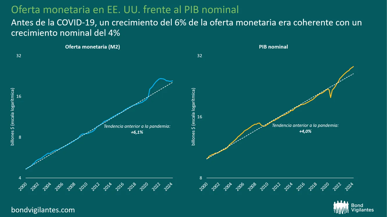 Dada la serie de acontecimientos económicos ocurridos a lo largo del primer cuarto de este siglo, hemos visto con regularidad como se aplicaba una política monetaria no convencional. El QE ha estado en funcionamiento de forma intermitente durante gran parte de este periodo, con el fin de facilitar un crecimiento estable de la oferta monetaria. En los 20 años anteriores a la pandemia, la Reserva Federal consiguió en general mantener un nivel estable de crecimiento de la oferta monetaria. Sin embargo, las agresivas medidas del QE aplicadas desde la COVID han provocado un aumento significativo de la oferta monetaria, contribuyendo a las subsiguientes presiones inflacionistas.