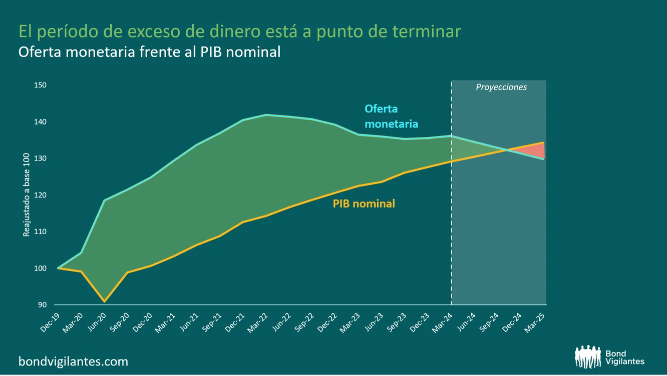 Es bien sabido que la política monetaria funciona con desfases que pueden ser largos y variables. Si llegamos a diciembre de este año y el QT real persiste, o los bancos centrales no están aumentado el efectivo en el sistema a la tasa QN, entonces habría, por definición, un argumento monetario para que la inflación quedara por debajo de su objetivo. Si esto ocurriera, la inflación sería lo suficientemente baja como para alentar recortes significativos de los tipos de interés.