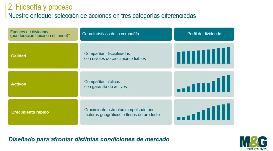 Nosotros estamos convencidos de que la inversión en dividendos no tiene por qué limitarse a aportar estabilidad. Es importante construir una cartera equilibrada de acciones con dividendo que combine diferentes características, con objeto de afrontar un abanico de condiciones de mercado. A fin de proteger a los inversores del sesgo defensivo de tales estrategias, el equipo de income de M&G invierte en tres categorías de crecimiento del dividendo: «calidad», «activos» y «crecimiento rápido».